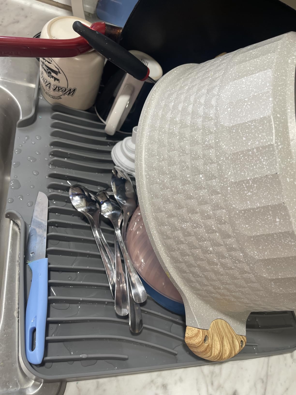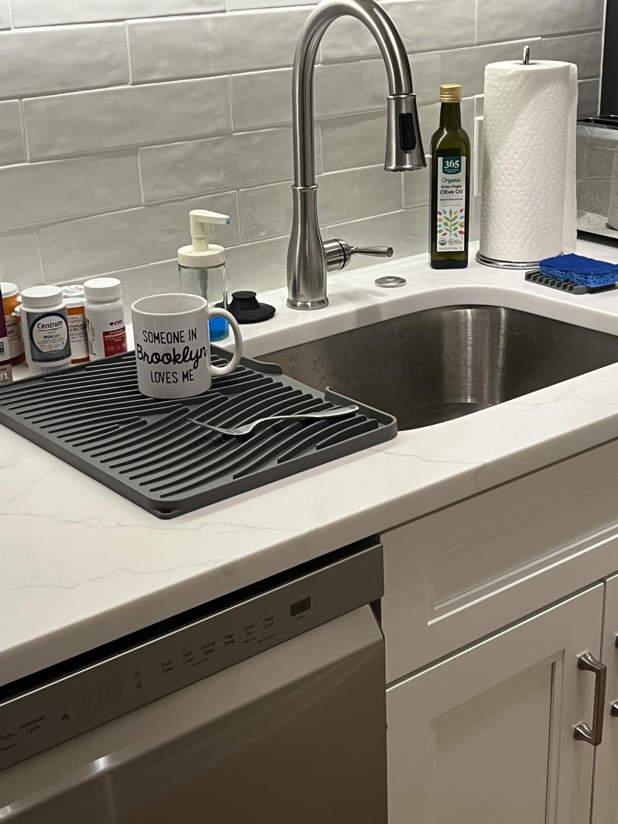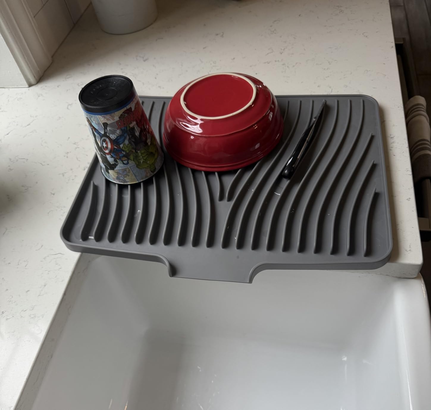 Picture walking into your kitchen in the morning — clean worktop, nothing to move, nothing to wipe under. Your dishes dried exactly where you left them, and the mat looks like it was chosen on purpose.