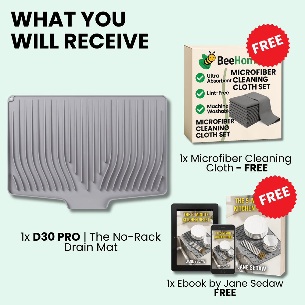 Most mats deserve that reputation — because they lie flat against the surface, trapping water with nowhere to go. The D30 PRO works differently: raised diagonal ridges lift the mat and your dishes completely off the worktop, so air circulates underneath and water flows along the ridges and out through the built-in drain rim directly into your sink. Nothing sits. Nothing pools. And because it's fully dishwasher safe, you can clean it properly — not just rinse it and hope. At Beehomie, we back that with a 30-day money-back guarantee. If it goes slimy, send it back. It won't.