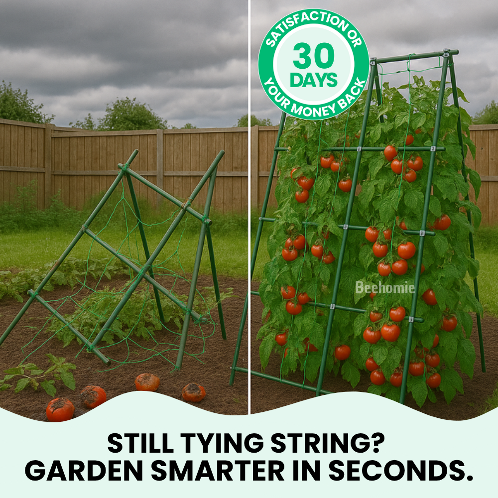 You clip in four canes, form a square, and watch your tomatoes rise tall and proud.