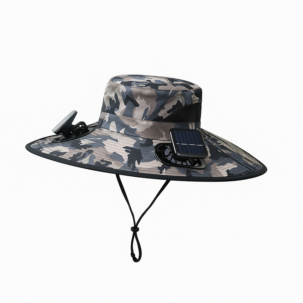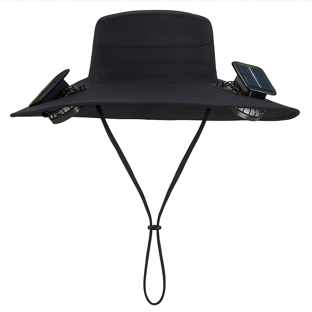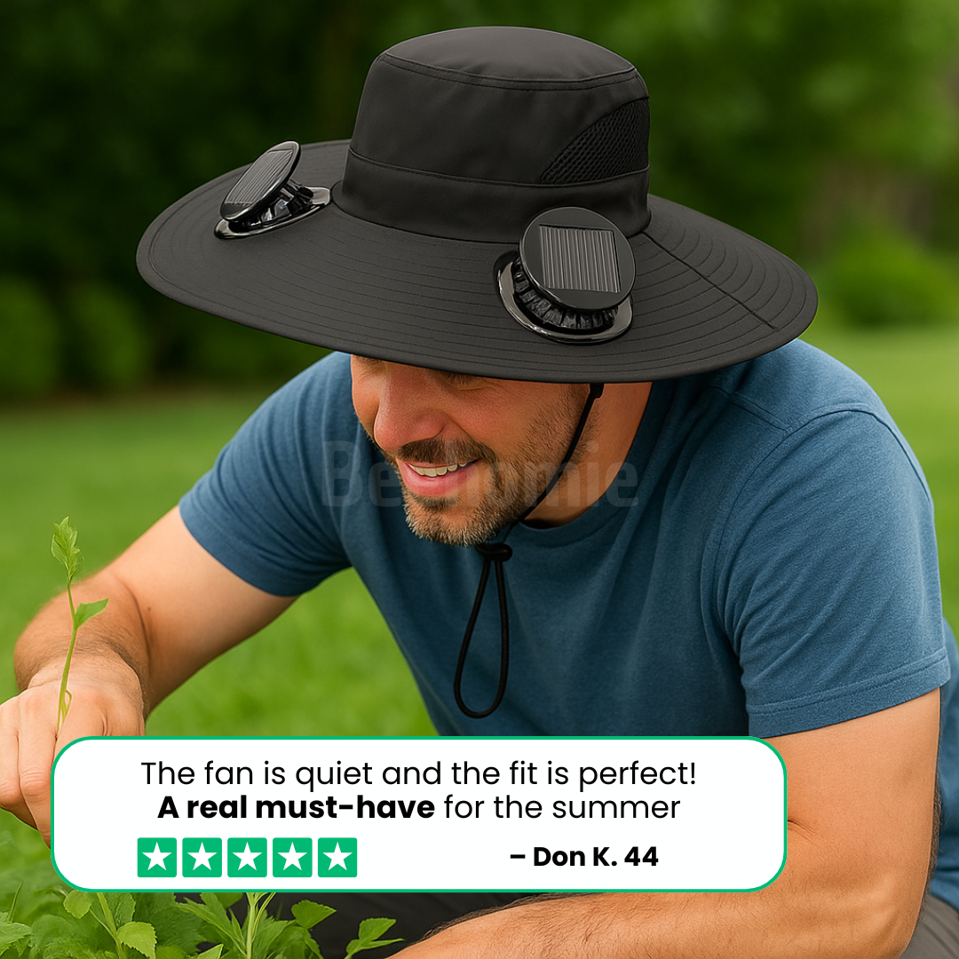Your hat gives you full shade, while a quiet fan circulates cool air around your face.