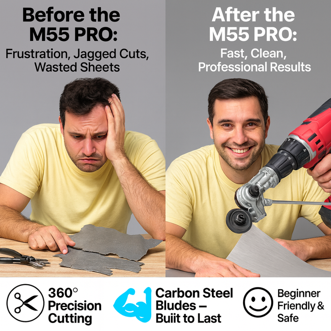 You snap the M55 PRO onto your drill, line it up, and cut clean, fast, accurate lines through your metal sheet. No resistance. No jagged tear. Just pure satisfaction.