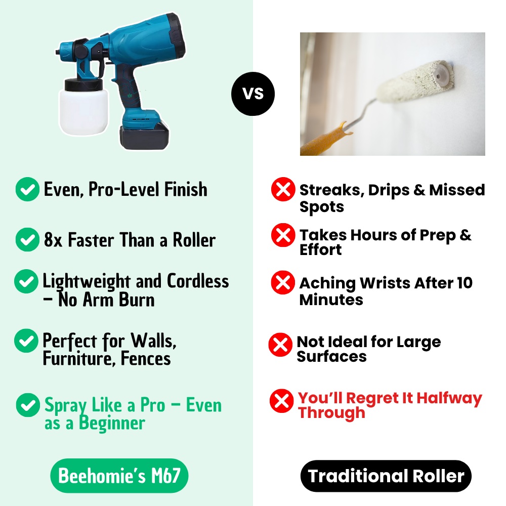 That’s the magic of the M67 Pro™. Its precision nozzle creates an ultra-fine mist, delivering a smooth, even finish that rollers can’t match – especially on textured surfaces, trims, or edges.