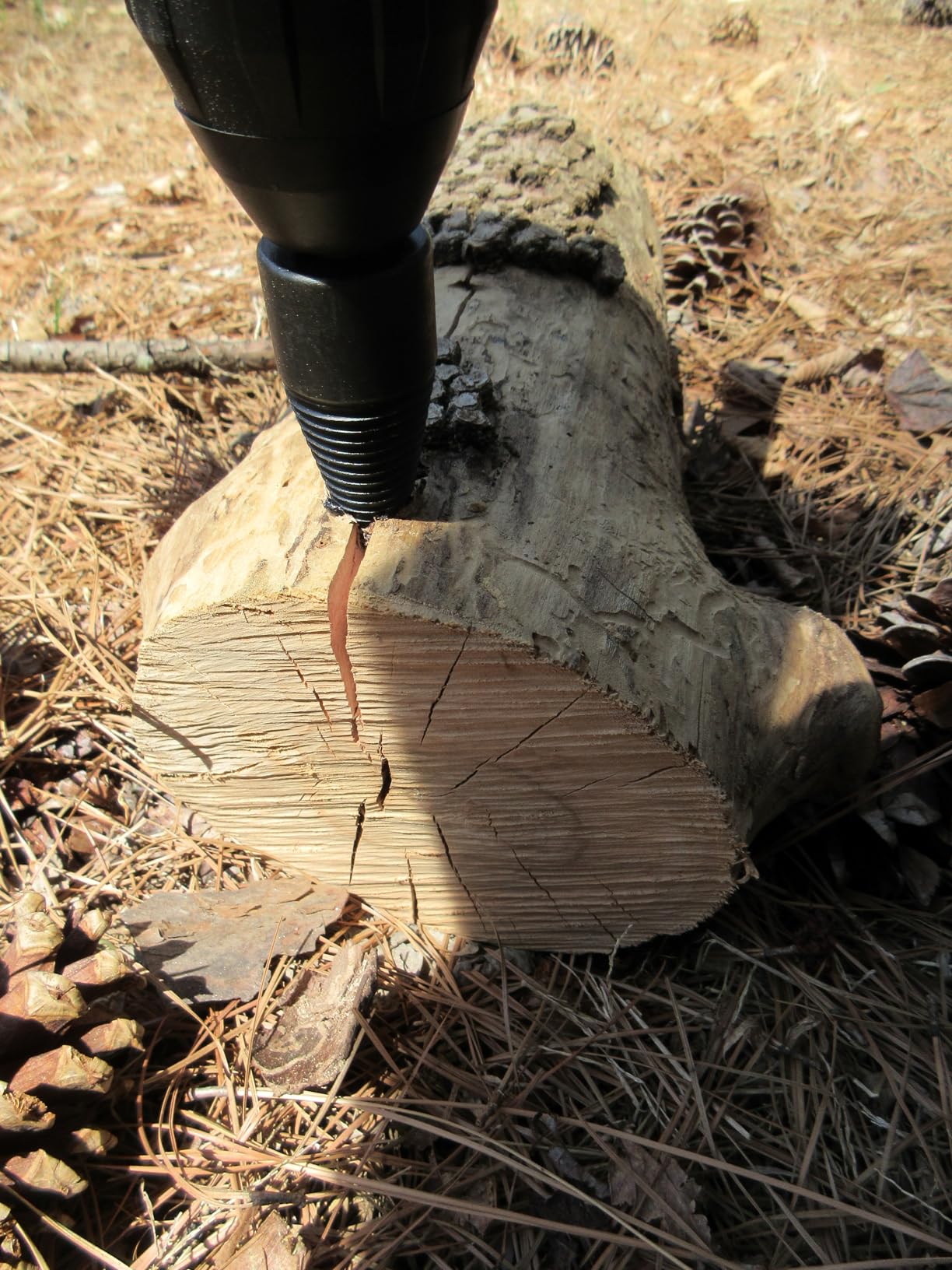 And always drill near the ends of the log, not the centre — this reduces binding and makes the split much cleaner.