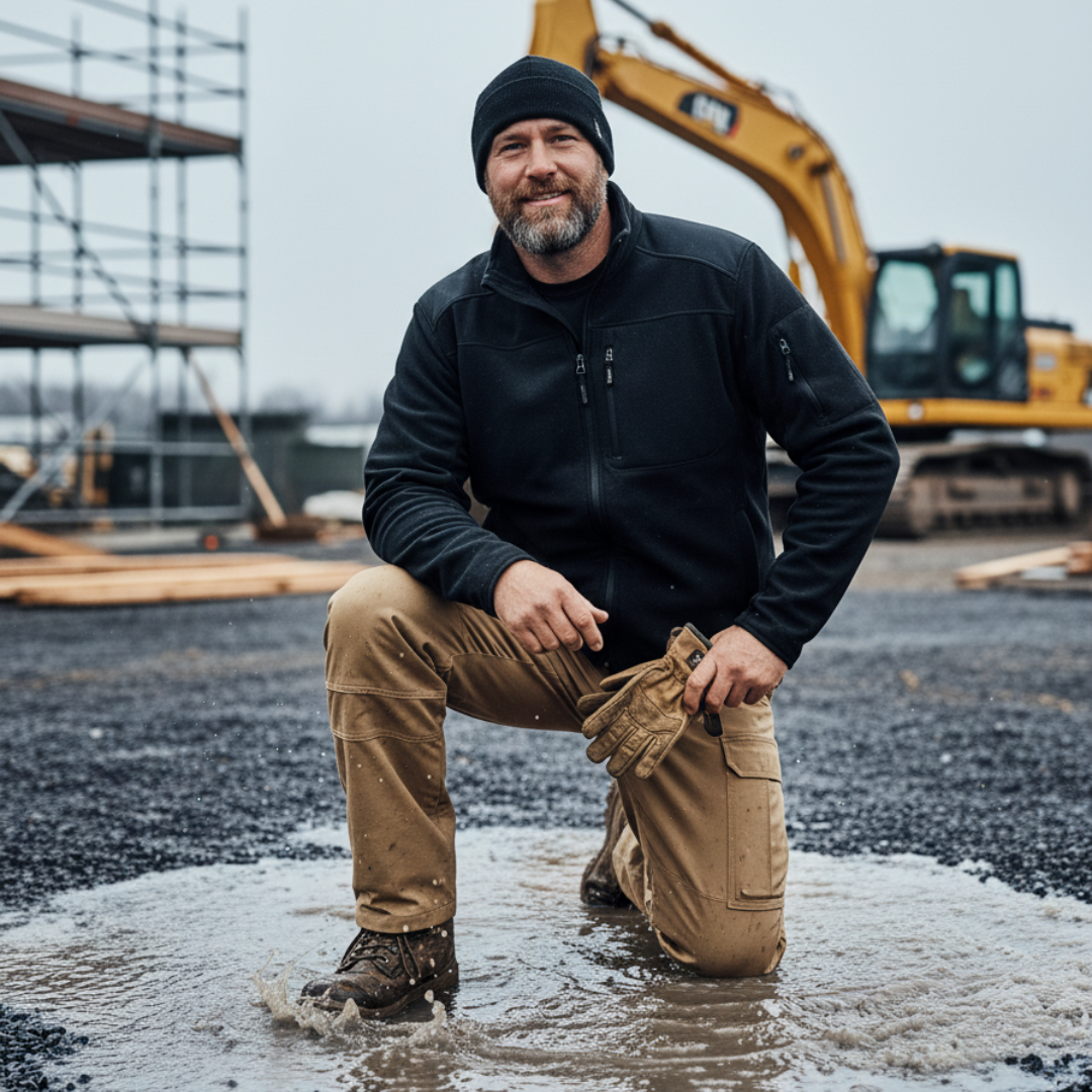 You’re lifting, kneeling, working — and your legs feel warm but breathable. No stiffness. No freezing denim. No wet thermals.
