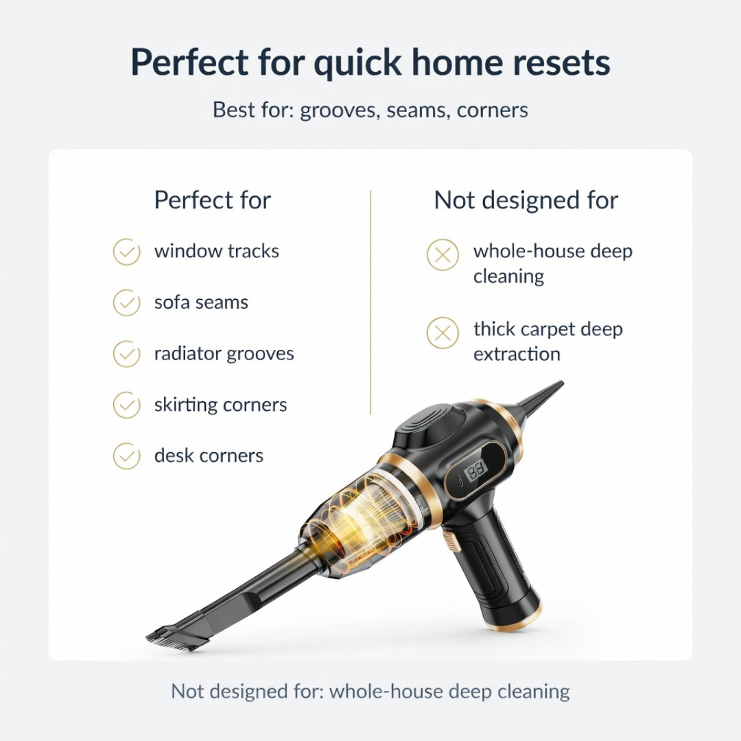 Even in a tidy home, dust and crumbs quietly build up in the places you never reach properly — sofa seams, window tracks, radiator grooves, skirting corners, and that gap behind furniture.